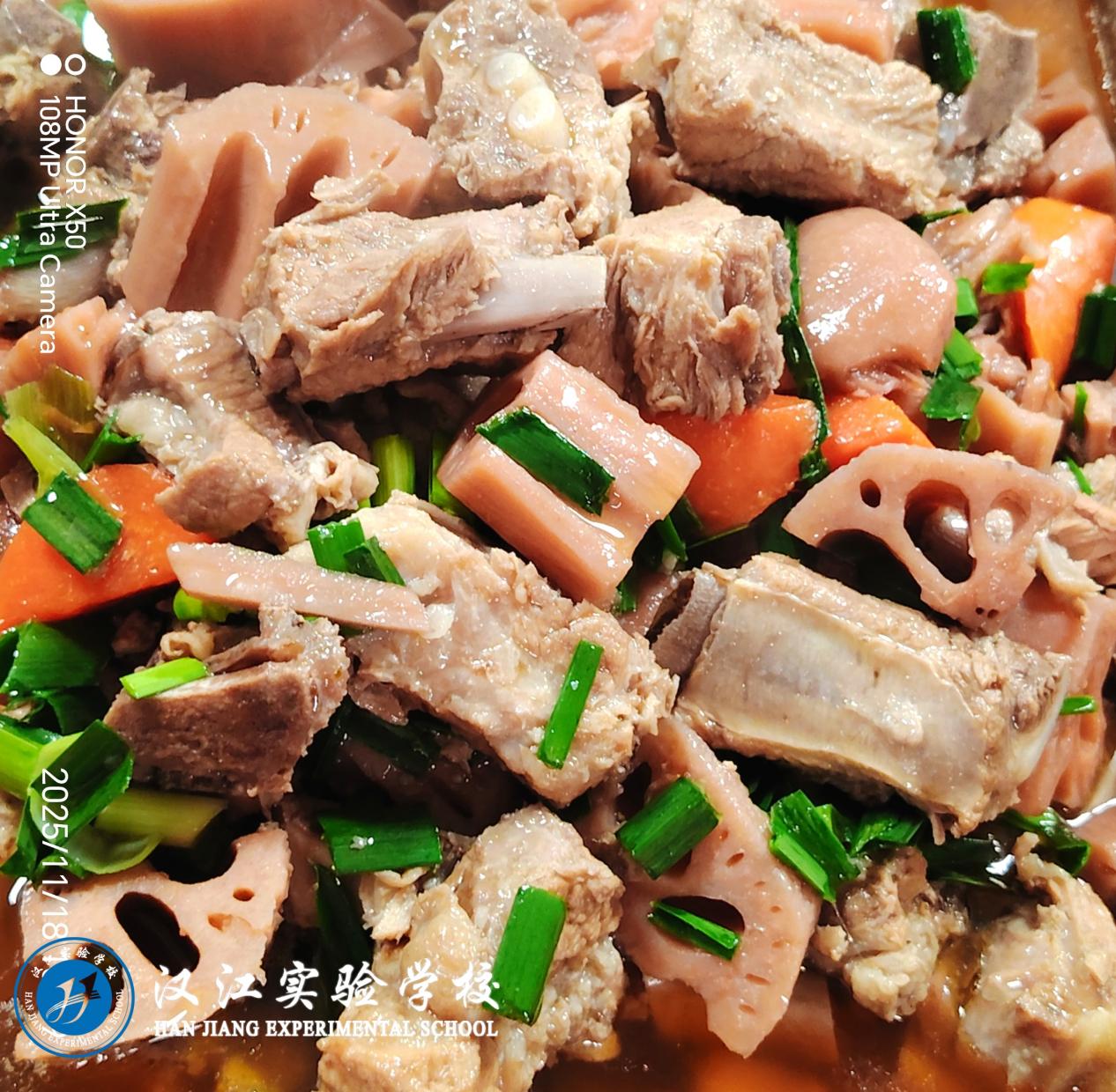 中餐:牛腩炖土豆、蒸鸡蛋糕、木耳香干肉片、白灼西生菜、美味老鸭汤、米饭