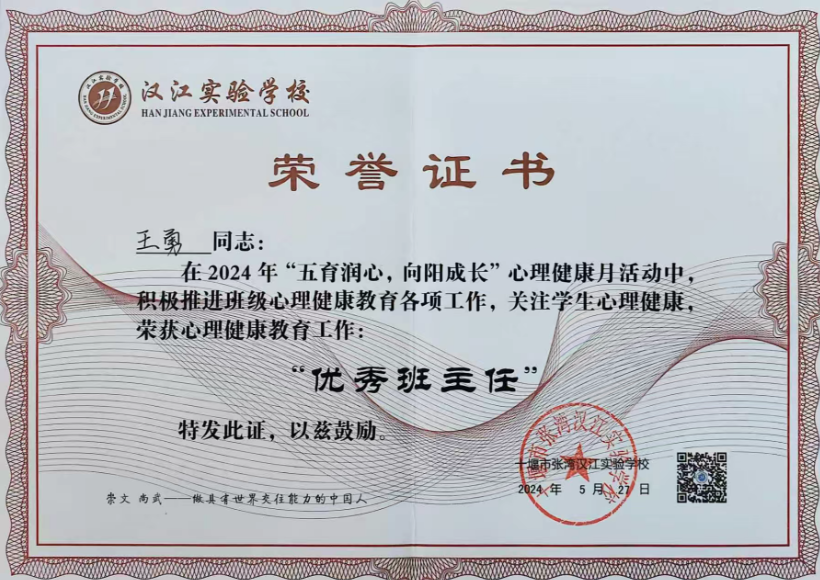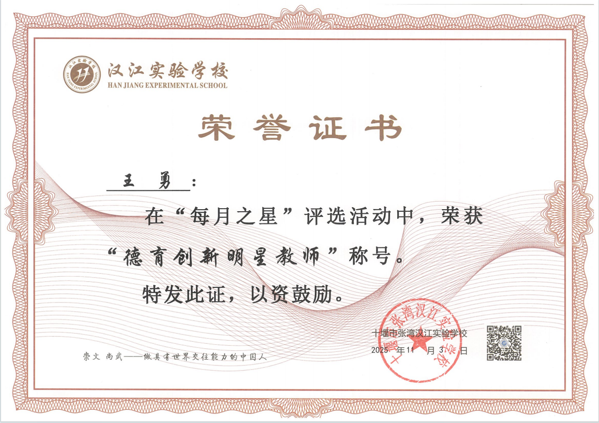 教育是一场温暖的修行,是用生命影响生命的过程。王勇老师以匠心守护初心,以担当诠释使命,在平凡的岗位上绽放着德育创新的光芒。未来,他将继续心怀热忱,与学生共赴成长之约,书写更多育人篇章!