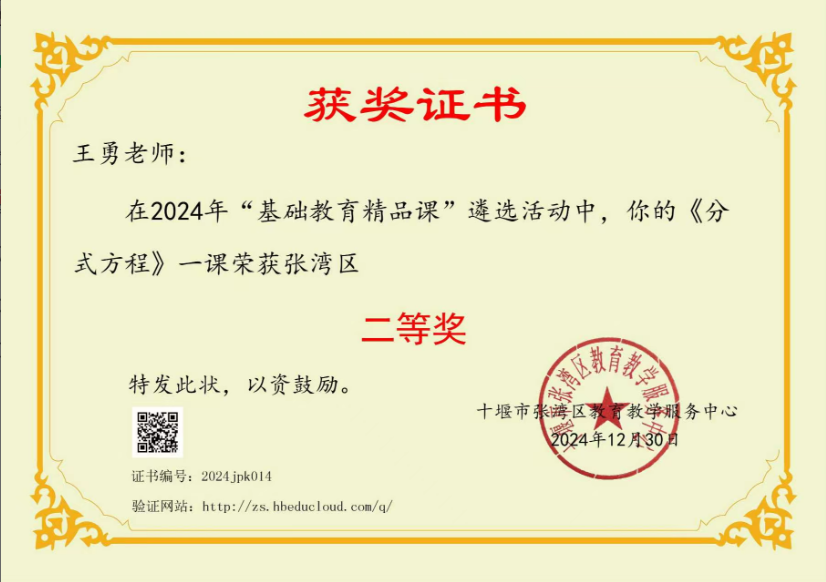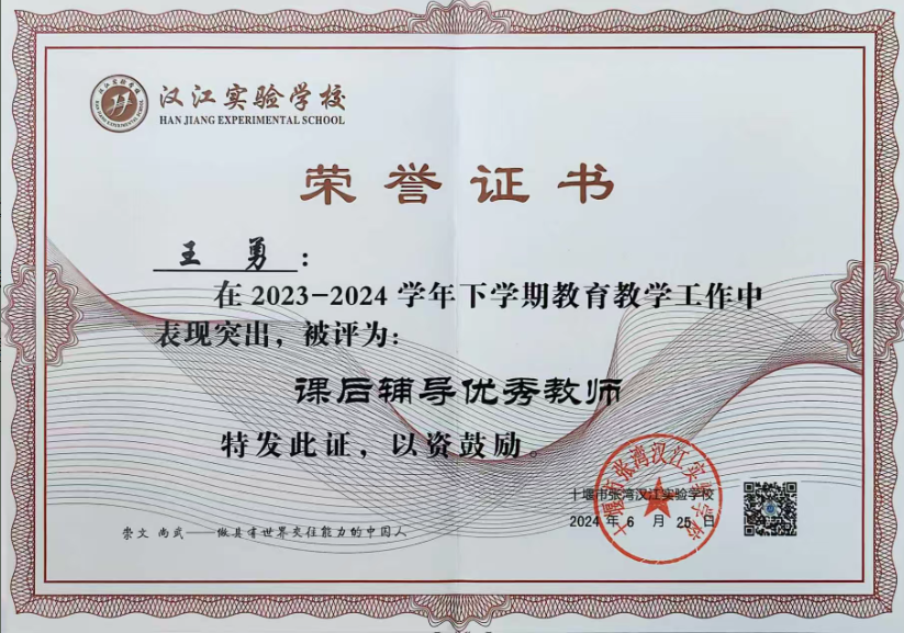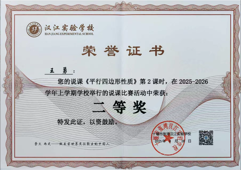 王勇,汉江实验学校九年级数学教师。从教八年来,他始终秉持“用心育人,以德化人”的教育理念,以严谨的治学态度和温暖的育人情怀,成为学生成长路上的引路人。在班级管理上,他用脚步丈量责任,将关爱融入日常管理的每一个细节;在数学课堂上,他以巧妙的办法化繁为简,激发学生潜能。曾获“优秀班主任”“优秀辅导教师”“区基础教育精品课二等奖”“说课比赛二等奖”等荣誉。他坚持“育人先育德,成才先成人”的原则,言传身教,完美诠释了“师者”的爱心与担当。他的勤勉与智慧,是学生前行路上最温暖的光!