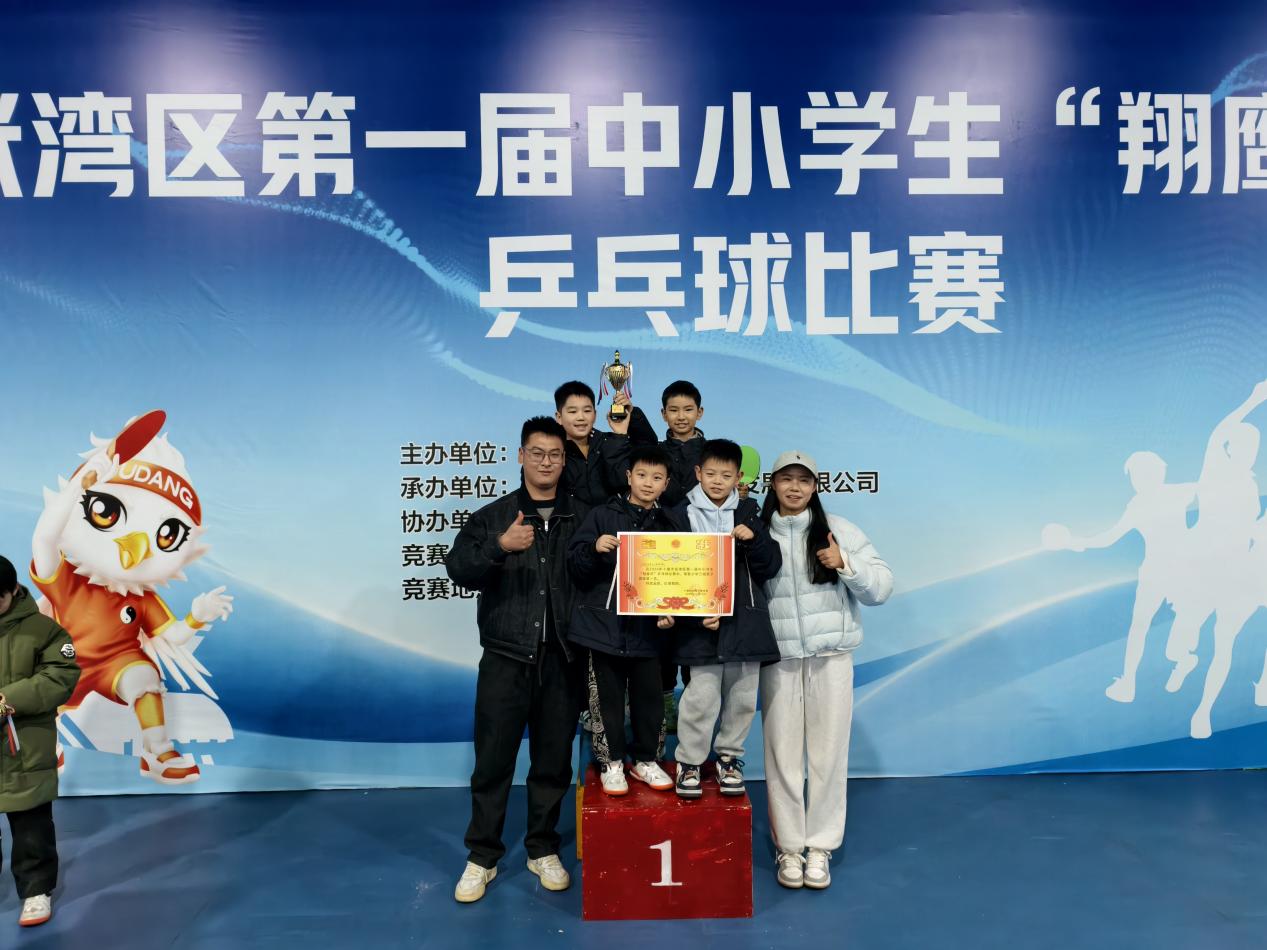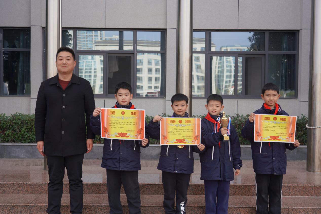 在张湾区第一届中小学生乒乓球比赛中,小学男子乙组的邓景文、安宇桐、袁浩霆、李博宣四位同学,组成了无坚不摧的“黄金搭档”。他们默契配合,敢打敢拼,一路过关斩将,勇夺团体冠军!金灿灿的奖杯,是对他们团结协作、为校争光精神的最好嘉奖!