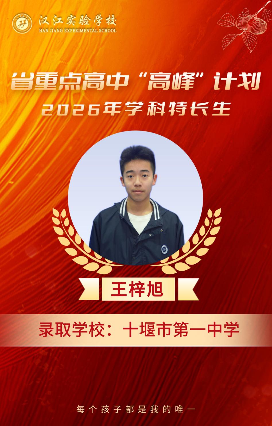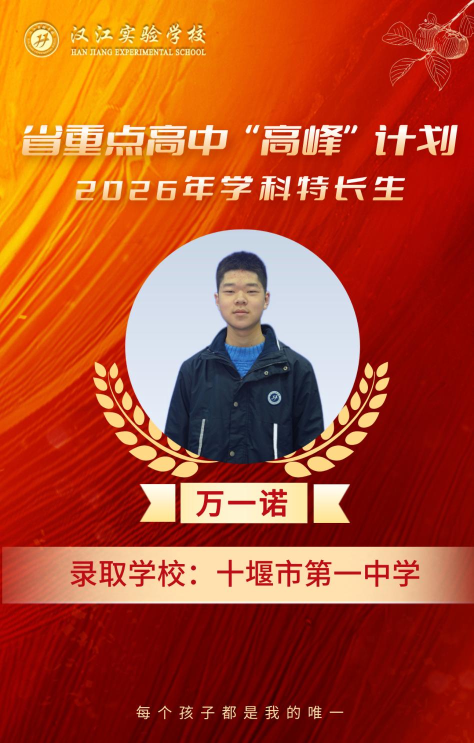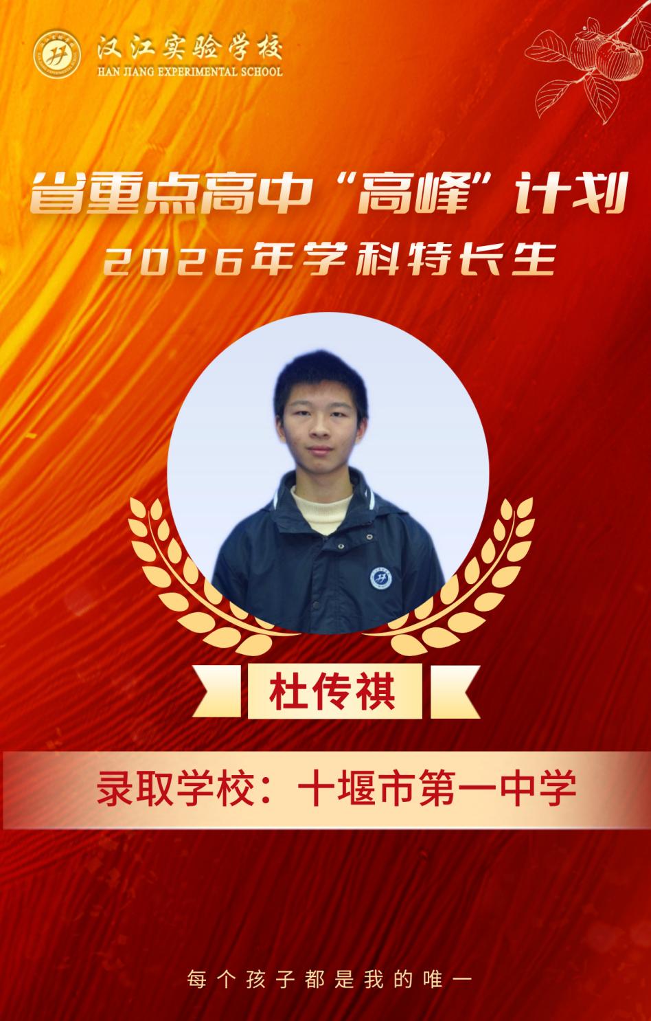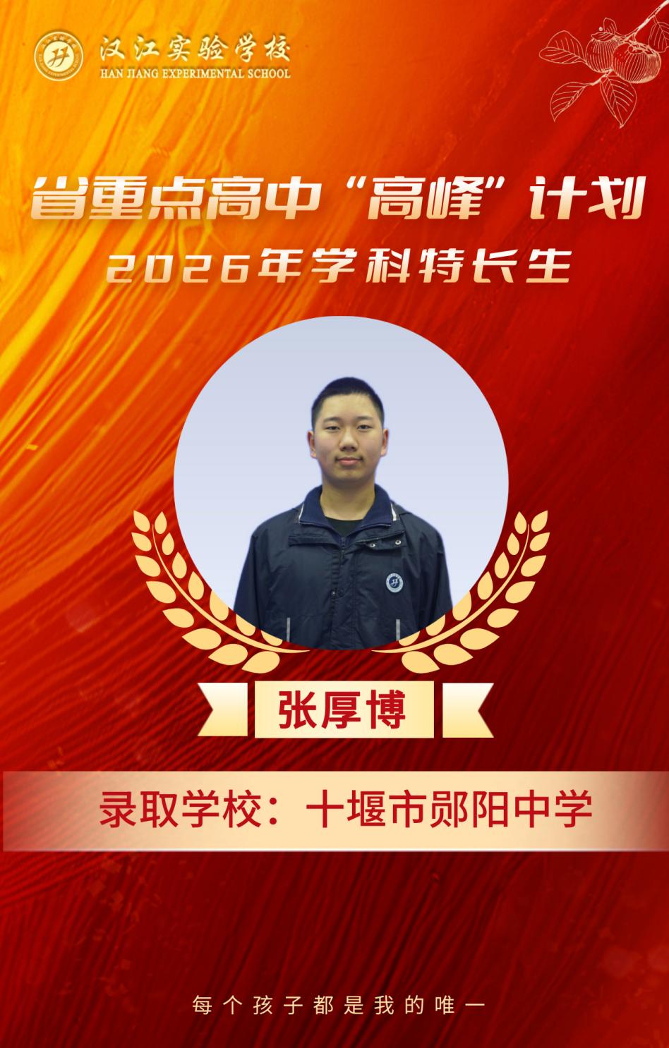 热烈祝贺我校九年级8名学子,在省重点高中“高峰”计划、2026年学科特长生选拔考试中脱颖而出,分别被十堰市郧阳中学、十堰市东风高级中学、十堰市第一中学三所省级示范高中顺利录取,金榜题名,不负韶华!