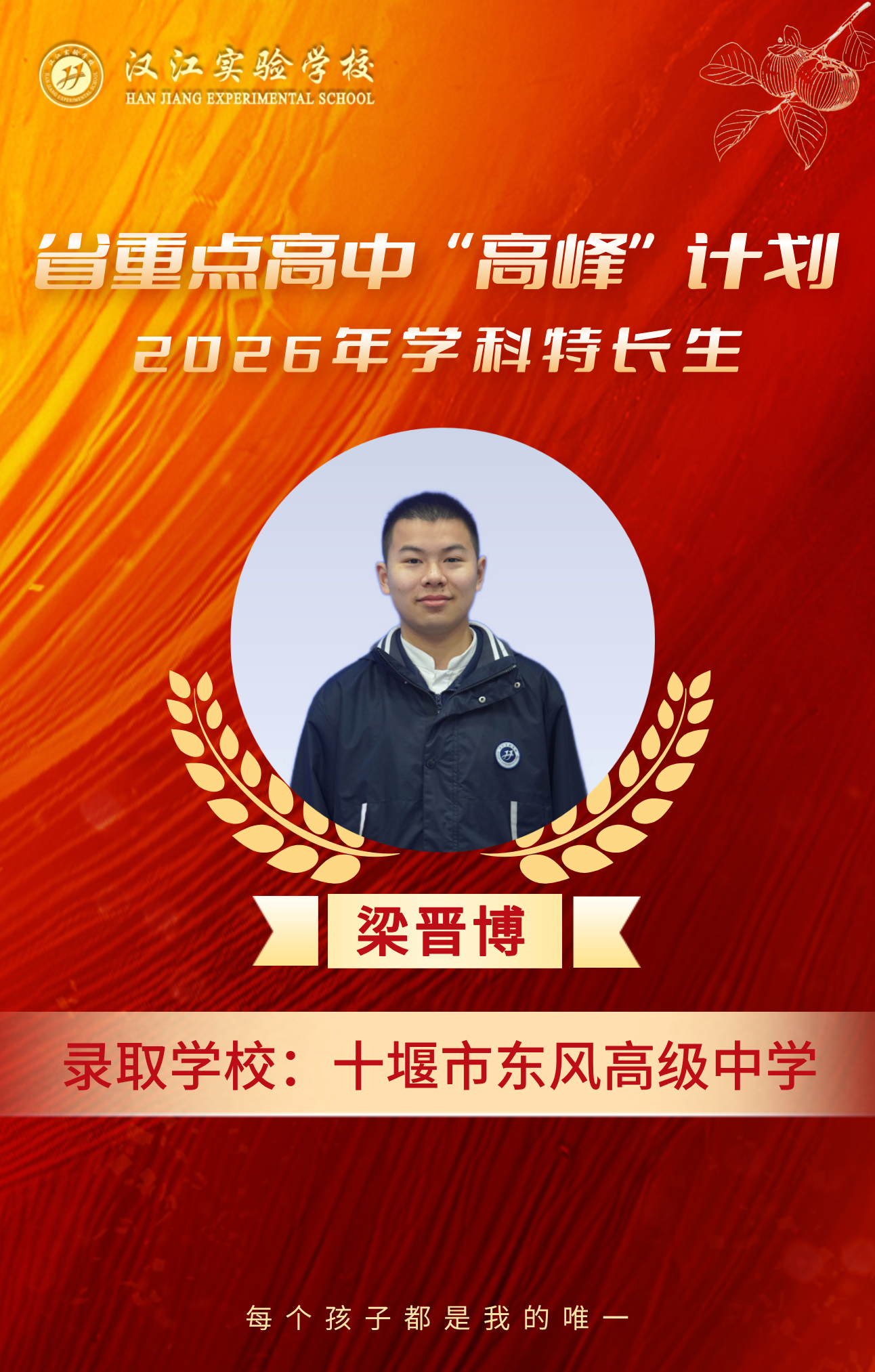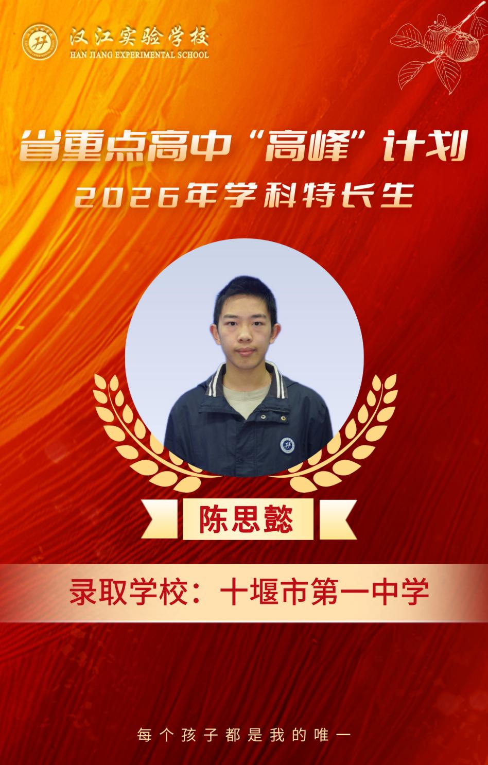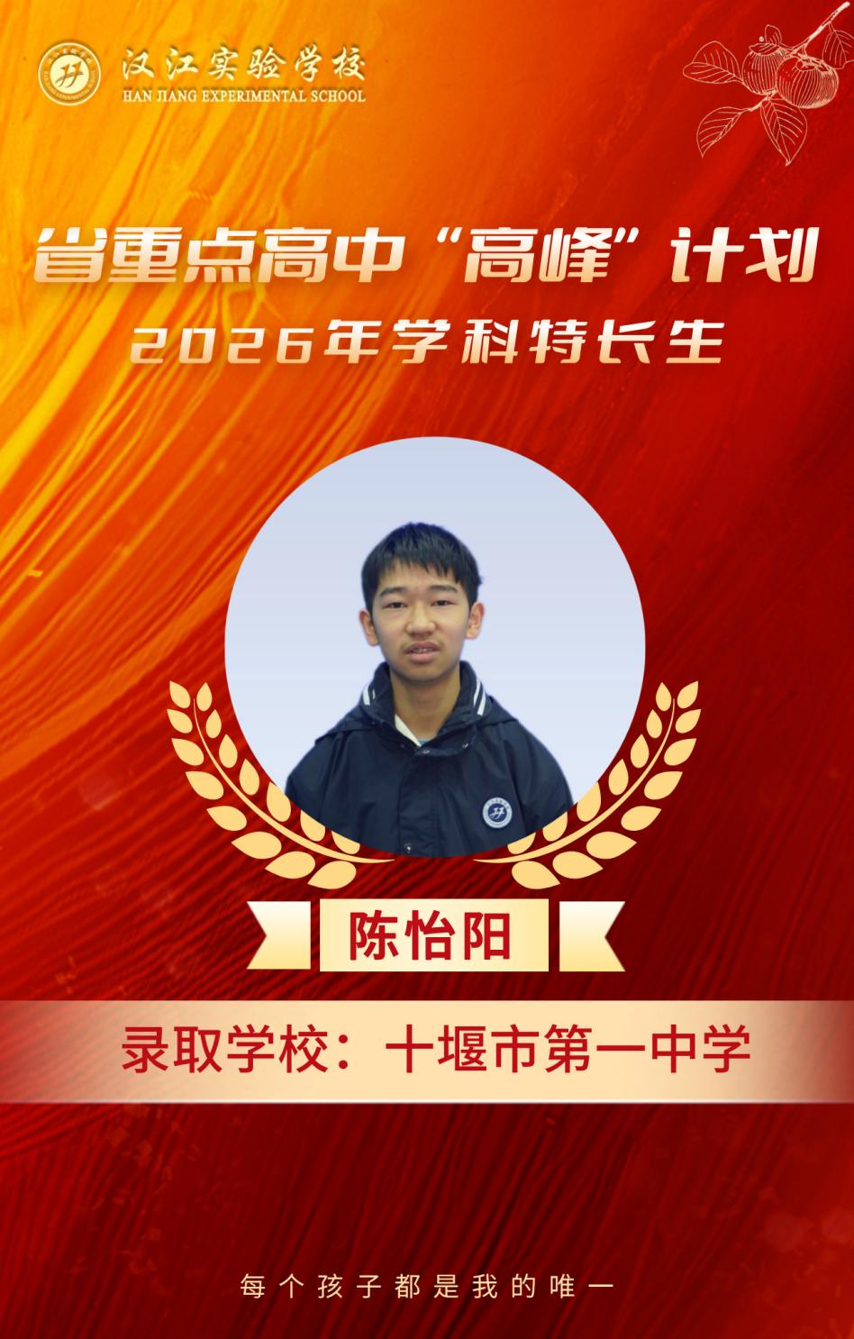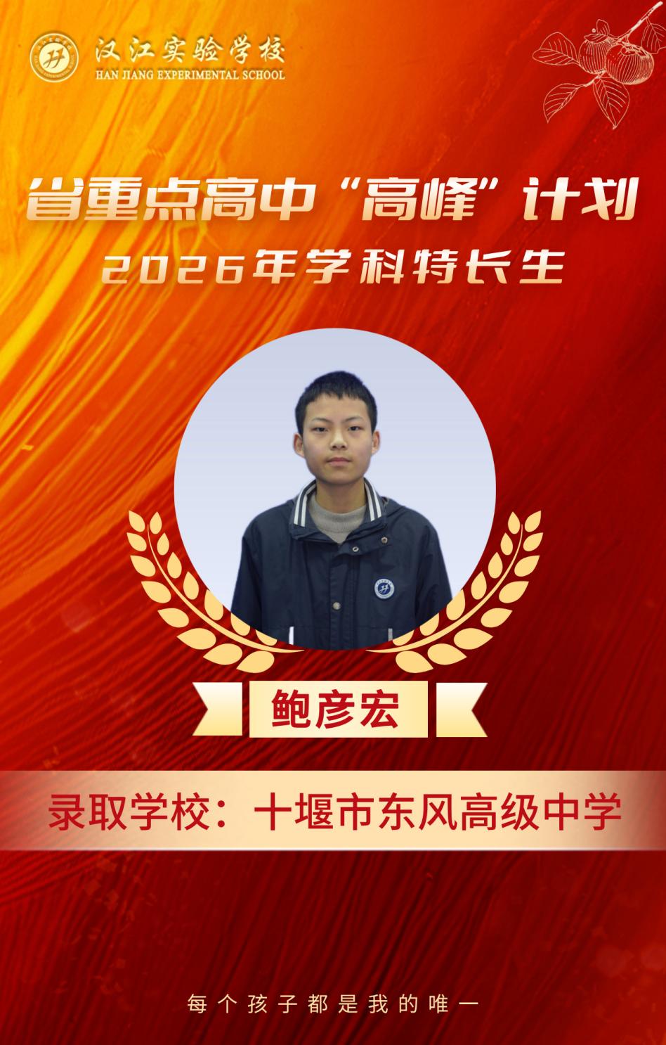 热烈祝贺我校九年级8名学子,在省重点高中“高峰”计划、2026年学科特长生选拔考试中脱颖而出,分别被十堰市郧阳中学、十堰市东风高级中学、十堰市第一中学三所省级示范高中顺利录取,金榜题名,不负韶华!