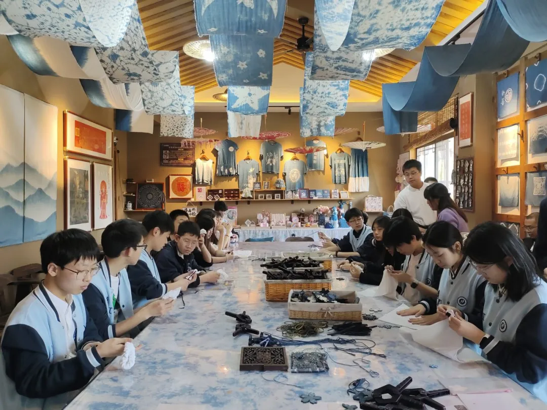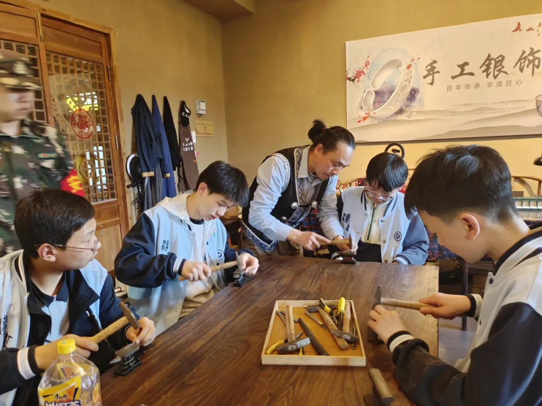 两个年级的学子均深度体验多项非遗课程,感受中华传统文化的博大精深。八年级学子先后参与《古法蓝染》《手工银匠》等五项课程,在专业老师指导下学习各类技艺、亲手制作作品,在实践中体悟非遗魅力,培养动手能力与文化传承意识;四年级学子则走进《古法蓝染》《中医眼罩制作》课堂,在趣味实践中了解传统工艺、制作专属作品,潜移默化厚植文化自信。