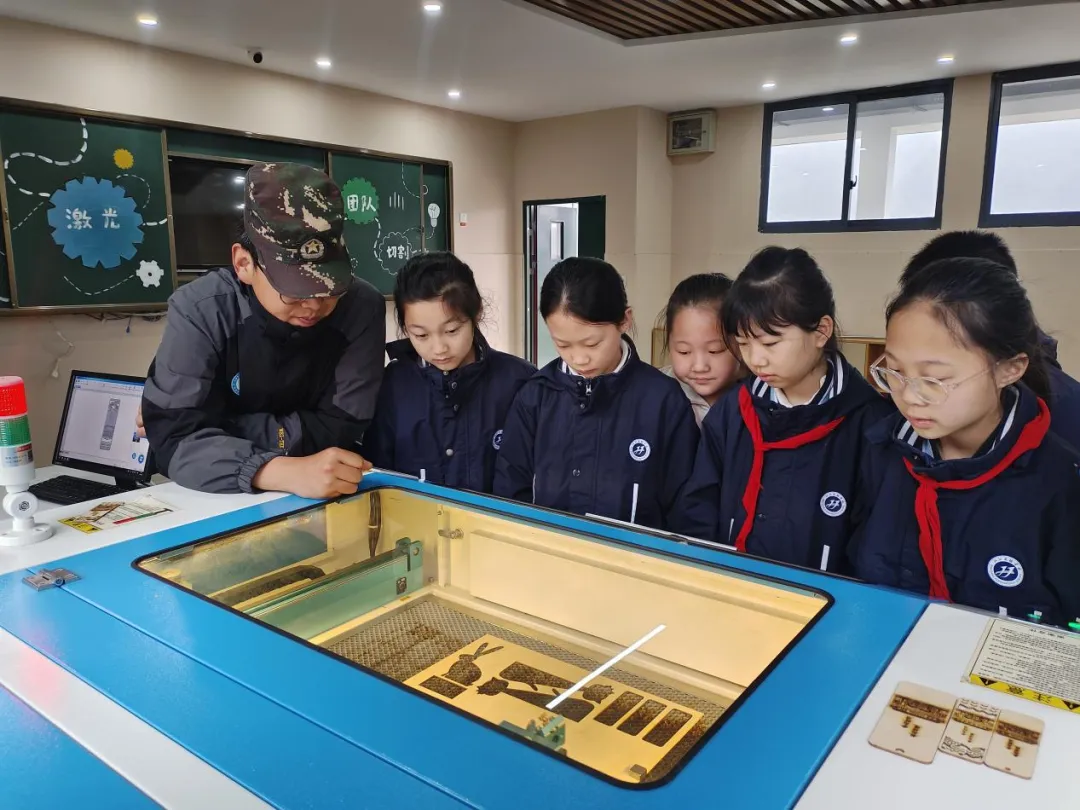 为培养学生科技兴趣与创新思维,同学们参观了解低空经济产业生态与前沿技术,参与 VR 模拟操作、观察无人机飞行实操,在趣味体验中拓宽科技视野、激发创新热情,树立产业责任与职业探索意识。此外,四年级学子还体验激光切割课程,了解其原理与安全操作,亲手制作校徽挂件,感受科技与创意的融合。