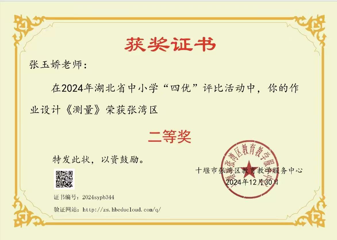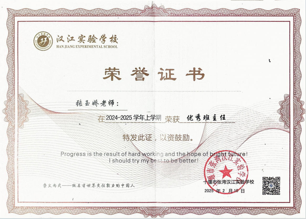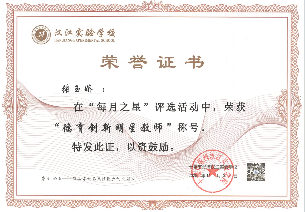 张玉娇,汉江实验学校四年级数学教师、数学备课组长、年级主任。身兼数职,却事事精进、面面出彩。她深耕课堂,善用巧思化抽象为具象。用耐心守护成长、用关爱温暖心灵,所带班级成绩优异,多次荣获“优秀班集体”“优秀班主任”称号。她是学生眼中的良师、同事心中的标杆,更是教育路上坚定追光者!