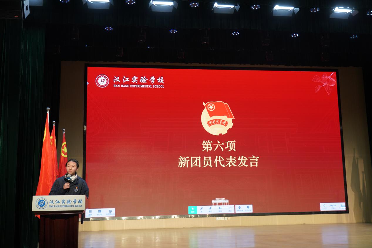 新团员代表赵怡婷登台,结合自身经历分享入团心得与未来规划,她以青春之声传递着对团组织的热爱,表达了对时代责任的深刻认知,生动展现出我校新团员朝气蓬勃、奋发向上的精神风貌。